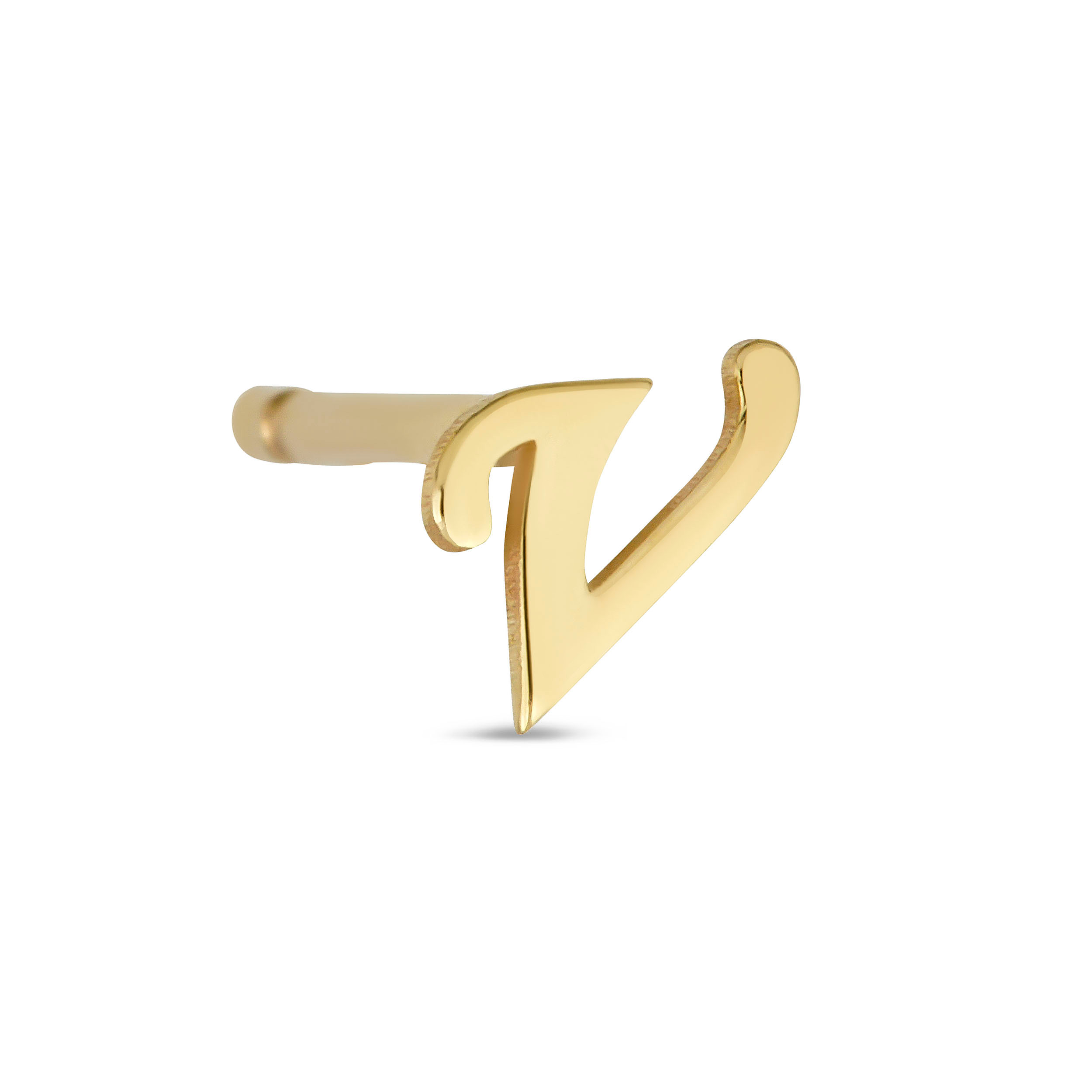 |  | 14k yellow gold script initial single stud earring - (v) | Style # | EINL2-V | Avg Weight | 0.35 gram(s) | Karat | 14 Karat | Length | | Quantity | 6 pcs | Location | A0076 | Price | $142.00 | |