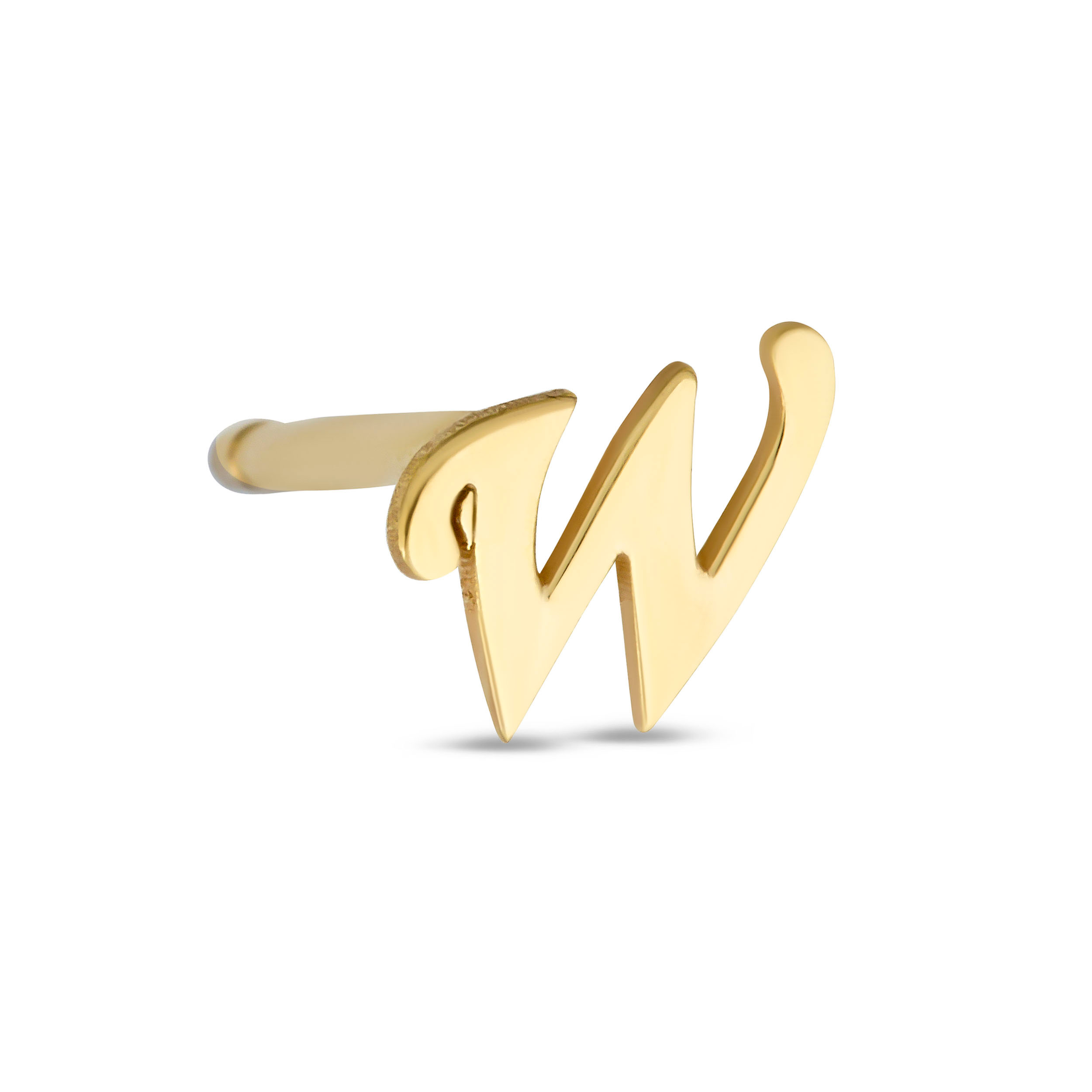|  | 14k yellow gold script initial single stud earring - (w) | Style # | EINL2-W | Avg Weight | 0.35 gram(s) | Karat | 14 Karat | Length | | Quantity | 5 pcs | Location | A0076 | Price | $142.00 | |
