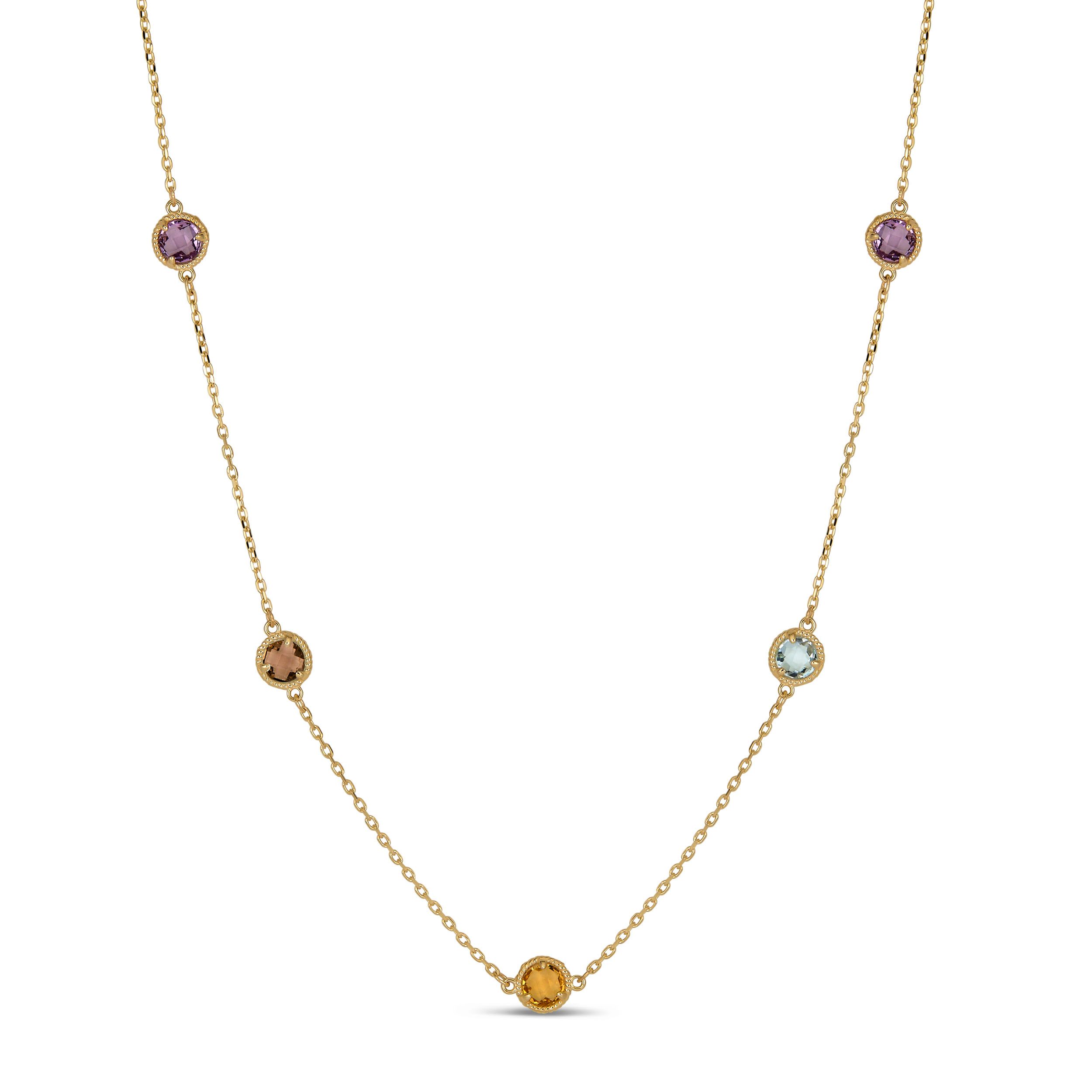 |  | 14k yellow gold 5.5mm multi-gemstone station adjustable length necklace | Style # | MGS55-1618TD | Avg Weight | | Karat | 14 Karat | Length | 18 inches | Quantity | 24 pcs | Location | 86 | Price | $1,203.00 | |