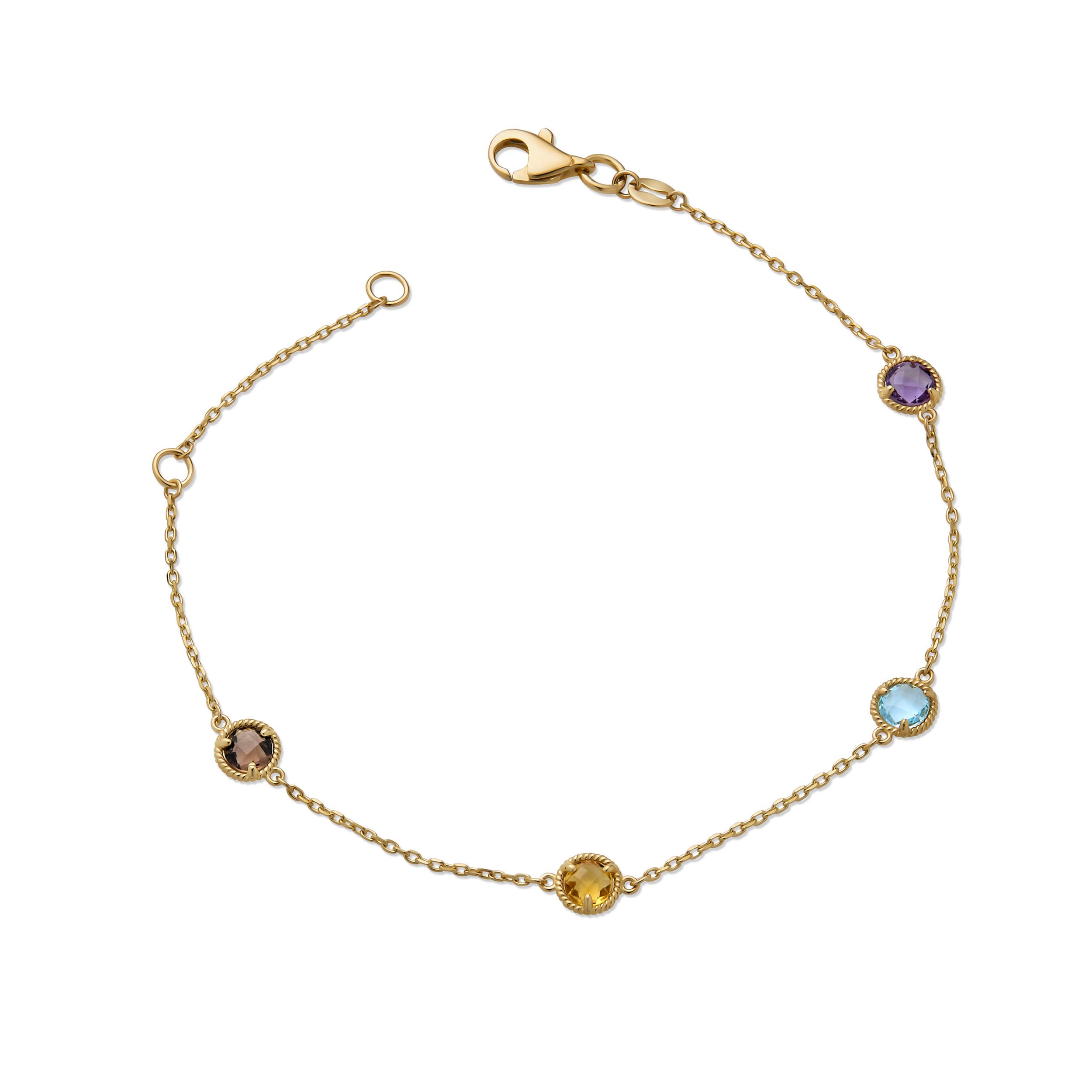 |  | 14k yellow gold 5.5mm multi-gemstone station adjustable length bracelet | Style # | MGS55-6575TD | Avg Weight | | Karat | 14 Karat | Length | 7.5 inches | Quantity | 21 pcs | Location | 86 | Price | $794.00 | |