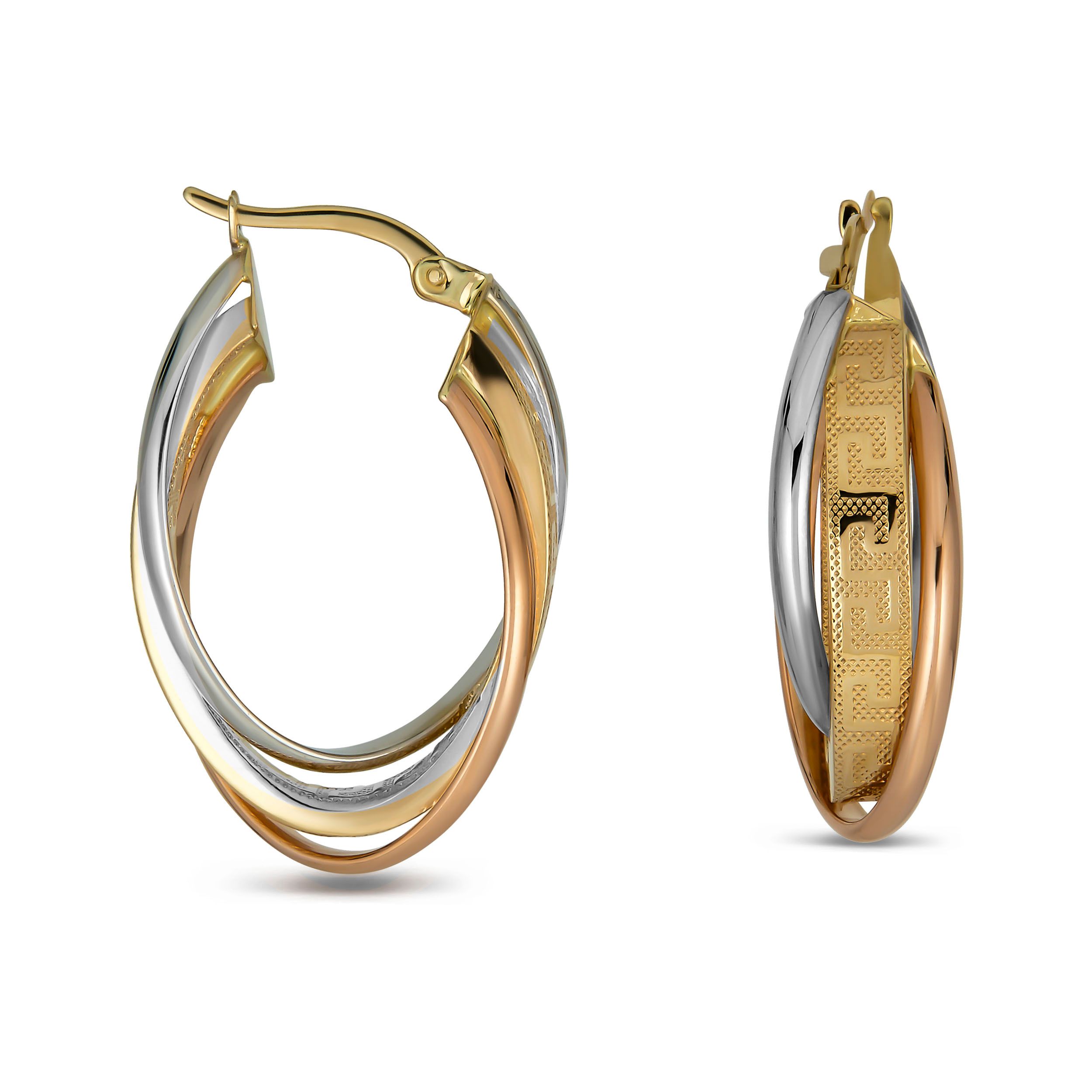 |  | 14k tricolor gold greek key triple oval hoop earrings | Style # | OBEH3XGKTC | Avg Weight | 4.25 gram(s) | Karat | 14 Karat | Length | | Quantity | 4 pcs | Location | 220 | Price | $1,208.00 | |